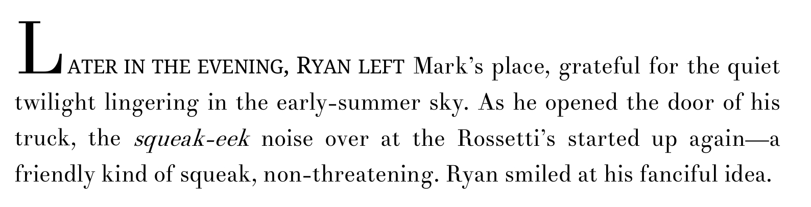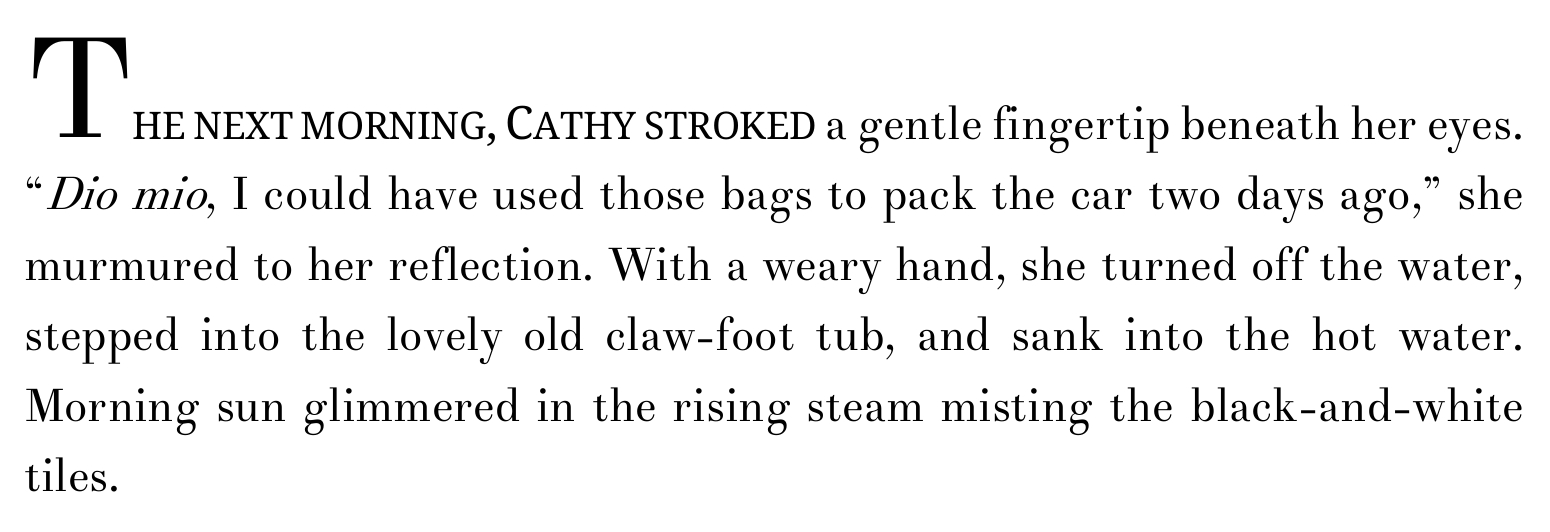 Typically the large leading capital is in the same font as the text. For an extra-special treatment, another font that matches the genre of the book, can be used. This fancy dropped caps font matches the font on my cover, pictured below.