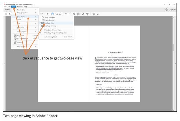 Why not try looking at your book as if it was already printed—in two-page layout? To get there, with your book open in Adobe Acrobat, three clicks will do the job as shown in the screen shot. Because I have a big display, I also click on the negative sign to shrink the image a bit.