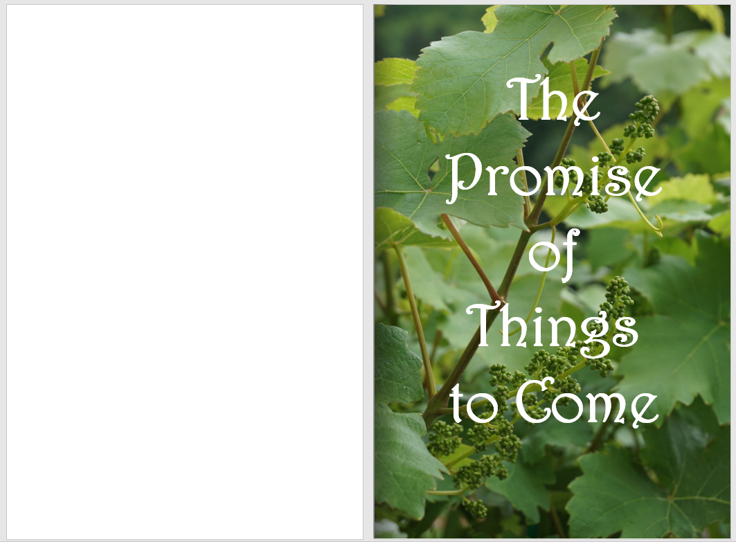 An image can be created to go beyond the margins like my mock-up of a wine book shown at the top of the page. This is bleed. The image will be cropped 1/8″ to 1/4″ on the top, outer edge, and bottom during printing. Also consider what will fall into the gutter at the bound edge of the book.