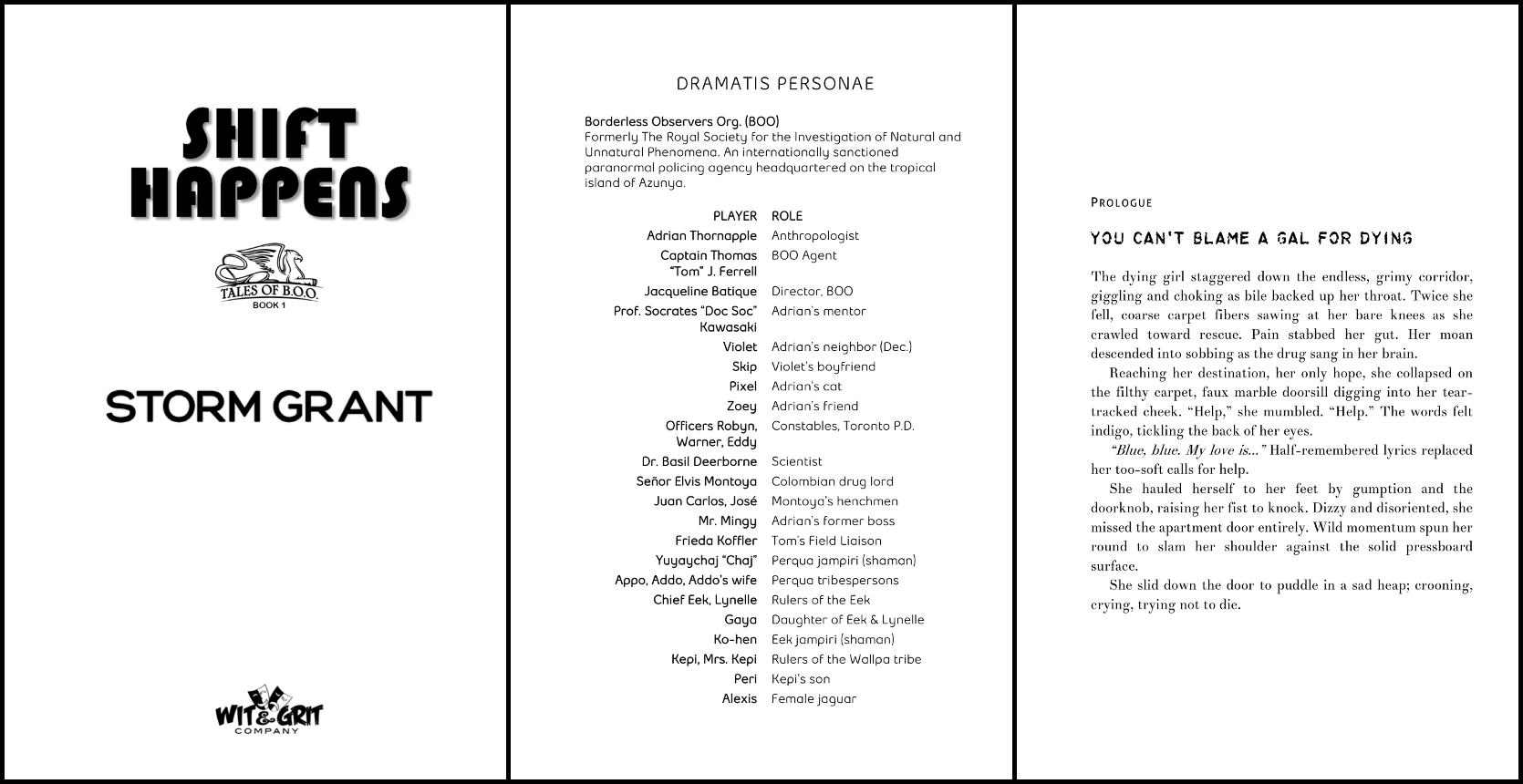 Design Notes: A dramatis personae (list of characters) can sort out your cast of characters. The design elements on the title page came from the cover artist. The layered chapter titles are managed in Word with two heading styles.